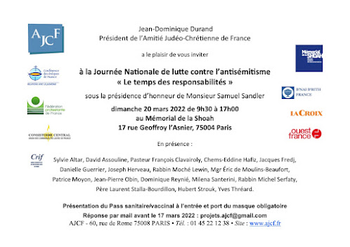 Dans un contexte de réaffirmation d’un antisémitisme décomplexé et de réécriture de l’histoire, l’Amitié Judéo-Chrétienne de France affirme avec ses partenaires, et avec ses quarante Groupes locaux répartis dans toute la France, sa volonté de lutter ensemble contre ce virus qui empoisonne la société en interrogeant l’engagement de tous dans ce combat vital.