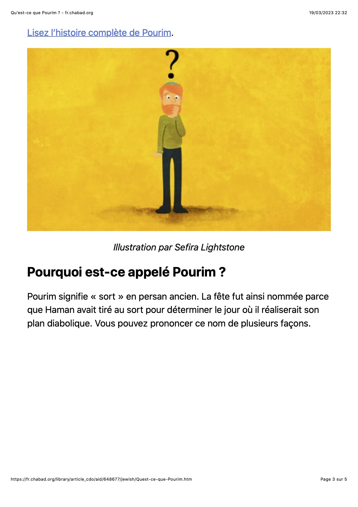 Une fois Pourim conclu, nous nous gardons bien de redescendre des sommets où notre chemin nous a conduits jusqu’ici. Bien au contraire, le calendrier juif nous indique la route : Nissan, notre prochain port, est déjà en vue. La sortie d’Egypte, et aussi celle de notre Egypte personnelle et intérieure, est juste au-devant de nous. Avec cette nouvelle période, la liberté entonne son chant éternel et glorieux et celui-ci résonne dans notre tête dès à présent. Un véritable défi nous est ici lancé. Saurons-nous passer de la délivrance de Pourim à celle de Pessa’h, ou, si l’on veut, saurons-nous entrer dans le temps de la Liberté majeure ?